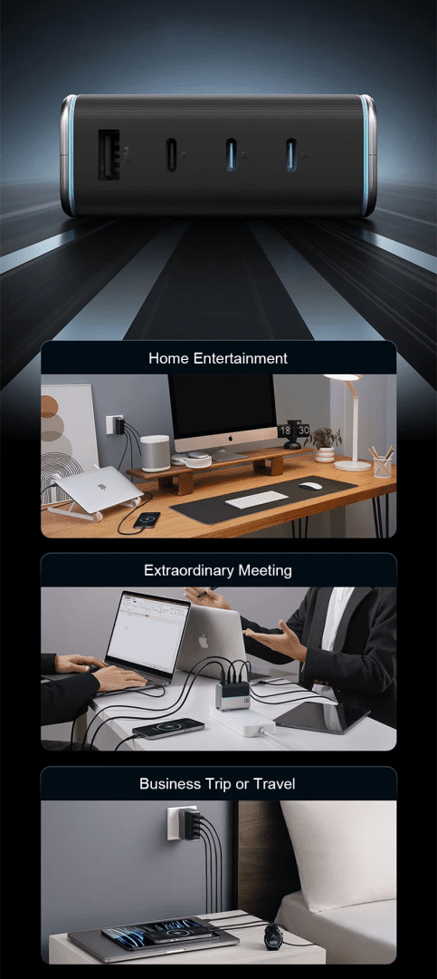- Gia đình và văn phòng: Với 4 cổng sạc, bạn có thể sạc cùng lúc nhiều thiết bị, từ điện thoại, máy tính bảng, tai nghe không dây đến laptop, đáp ứng nhu cầu sử dụng đa thiết bị trong gia đình hoặc môi trường làm việc.