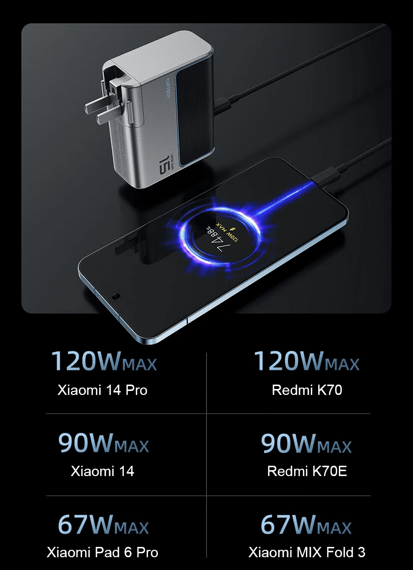 CUKTECH AD1404U tích hợp công nghệ Adapt Charge tự phát triển, có khả năng tự động nhận diện và phân bổ dòng điện phù hợp cho từng thiết bị. Nhờ đó, sản phẩm hỗ trợ nhiều chuẩn sạc nhanh như PPS, PD, QC, AFC, FCP và cả UFCS – tiêu chuẩn sạc hợp nhất mới nhất, đảm bảo tương thích rộng rãi với đa dạng thiết bị.