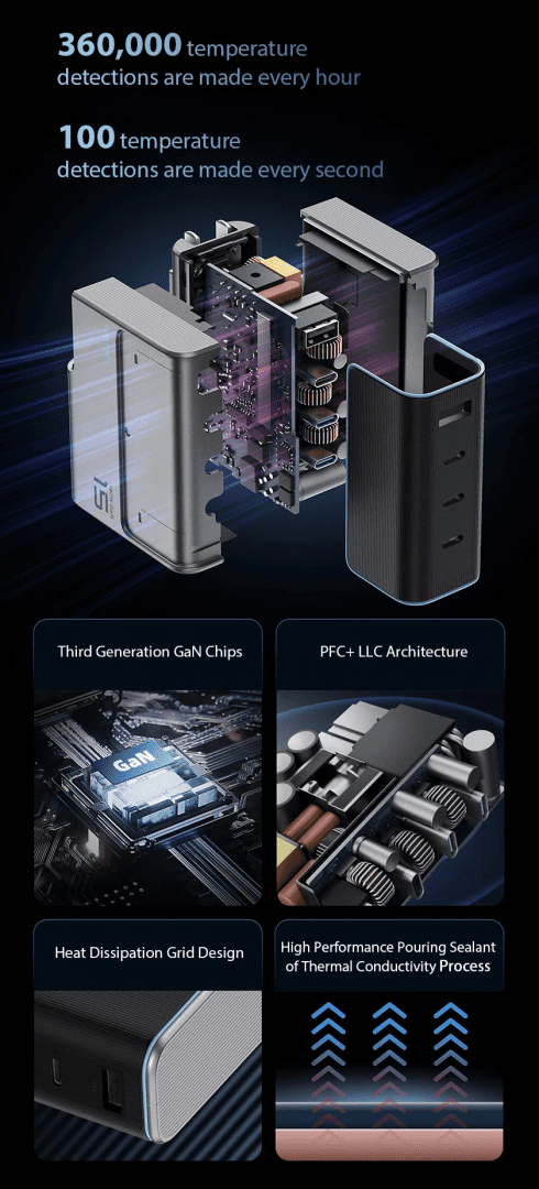 Hệ thống bảo vệ an toàn cũng được chú trọng với chip NTC chống quá nhiệt, quá áp, ngắn mạch và chống tĩnh điện, giúp bảo vệ cả bộ sạc lẫn thiết bị người dùng. Đi kèm với đó là khả năng tản nhiệt hiệu quả nhờ vật liệu GaN thế hệ 3 và thiết kế mạch điện tối ưu, giúp bộ sạc duy trì hiệu suất ổn định ngay cả khi hoạt động trong thời gian dài.