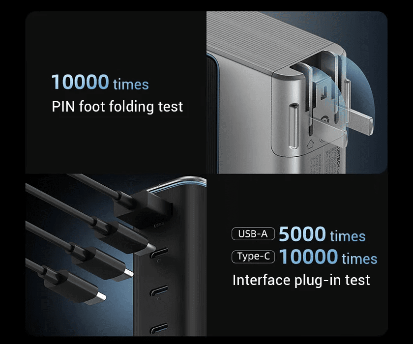 CUKTECH AD1404U được trang bị công nghệ PD3.1 với công suất tối đa 140W, đủ sức sạc đầy pin cho MacBook Pro hoặc các dòng laptop cao cấp trong thời gian ngắn. Hai cổng USB-C chính (C1 và C2) đều có thể cung cấp công suất 140W khi sử dụng riêng lẻ, đảm bảo thiết bị của bạn luôn được nạp năng lượng nhanh chóng và an toàn.
