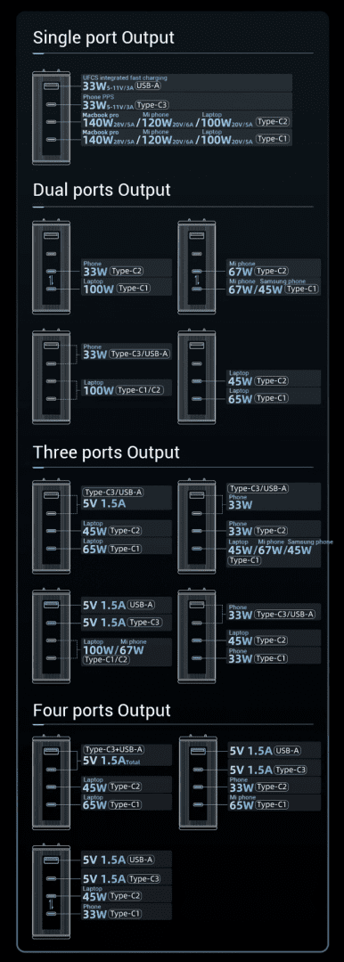 - Cổng sạc: 3 × USB-C + 1 × USB-A (tổng 4 cổng)