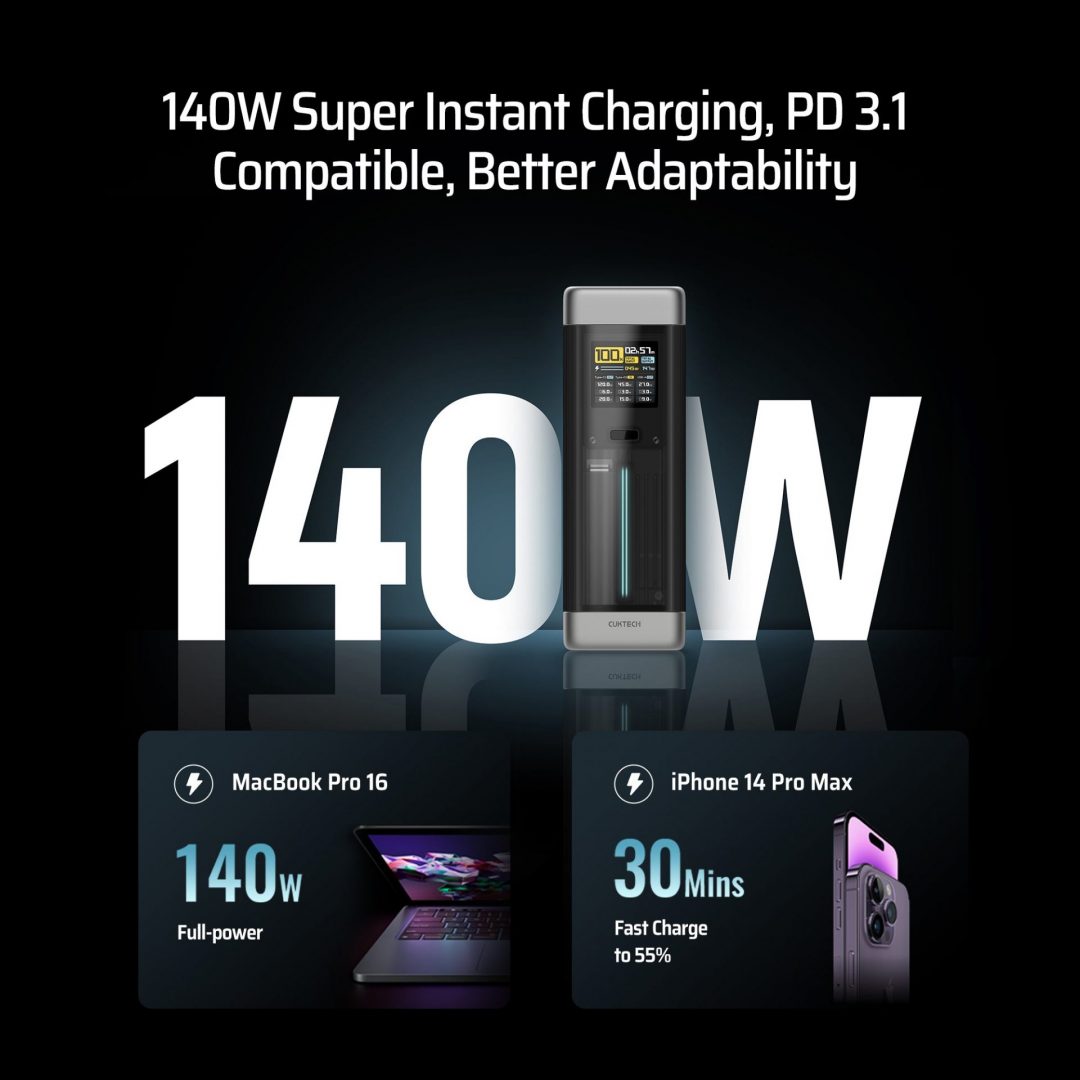 Một trong những điểm nổi bật nhất của CUKTECH P23 chính là khả năng sạc nhanh vượt trội. Với công suất tối đa lên đến 210W khi sử dụng nhiều cổng và 140W trên một cổng Type-C, sản phẩm này có thể dễ dàng sạc đầy các thiết bị có dung lượng pin lớn trong thời gian ngắn.