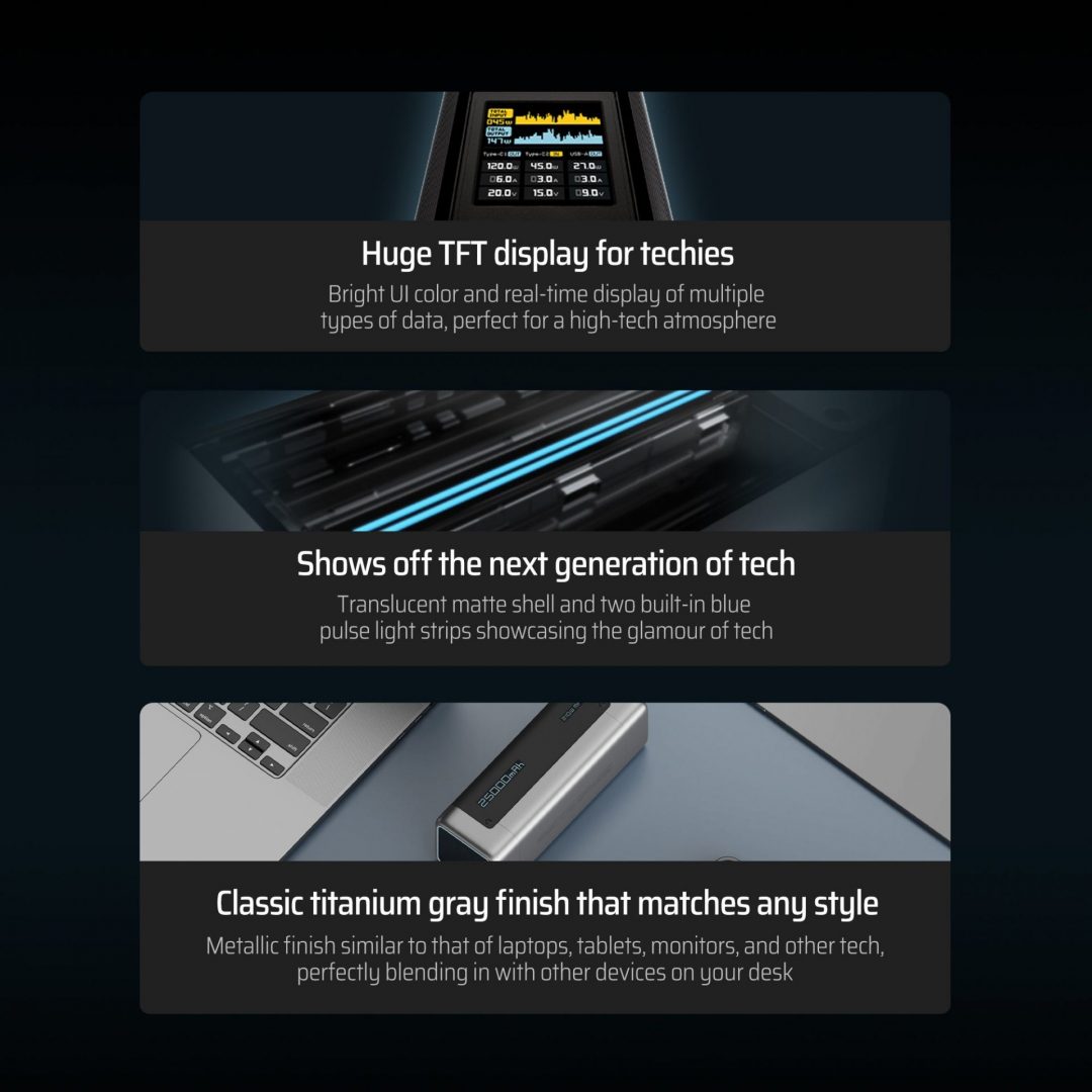 Một điểm nhấn khác của CUKTECH P23 chính là màn hình màu TFT 1.54 inch. Nhờ màn hình này, người dùng có thể theo dõi trực tiếp dung lượng pin, công suất sạc, điện áp và dòng điện theo thời gian thực. Tất cả các thông số được hiển thị rõ ràng, giúp bạn dễ dàng kiểm soát tình trạng hoạt động của thiết bị. So với pin dự phòng thông thường chỉ có đèn báo mức pin, màn hình thông minh này mang đến trải nghiệm hiện đại và chuyên nghiệp hơn, đặc biệt hữu ích với những ai thường xuyên sử dụng nhiều thiết bị cùng lúc.