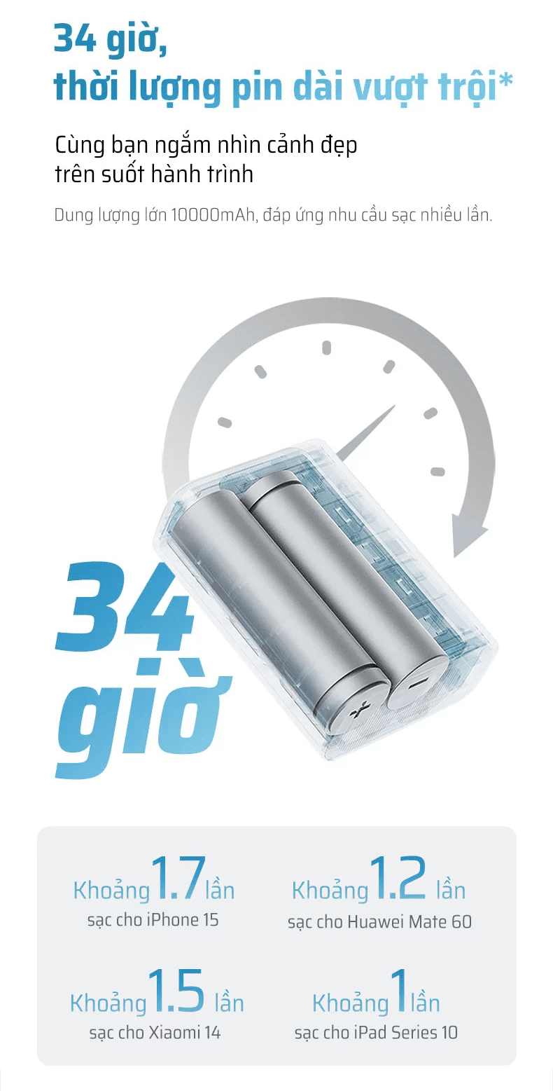 Với dung lượng 10000mAh, pin dự phòng này đủ để sạc iPhone khoảng 2–3 lần hoặc sạc đầy điện thoại Samsung 2 lần. Đây là mức dung lượng lý tưởng cho nhu cầu sử dụng di động hàng ngày, đảm bảo bạn luôn có nguồn năng lượng dự phòng khi cần. Ngoài ra, CUKTECH PB100 được tích hợp chip bảo vệ đa tầng, chống quá áp, quá nhiệt và quá dòng, giúp thiết bị và người dùng luôn an toàn trong suốt quá trình sạc.