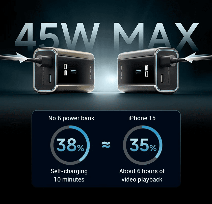 Cuktech PB060 6000mAh tích hợp công suất tối đa 55W, cho phép sạc nhanh điện thoại và máy tính bảng trong thời gian ngắn. Với chuẩn PD3.0, PPS và QC3.0, sản phẩm có khả năng điều chỉnh điện áp linh hoạt, giúp thiết bị nhận dòng điện phù hợp, giảm nguy cơ quá nhiệt hay hư hỏng pin. Người dùng có thể sạc đầy iPhone 15 hoặc Samsung S24 chỉ trong một thời gian ngắn, cực kỳ tiện lợi cho những người bận rộn, thường xuyên di chuyển.